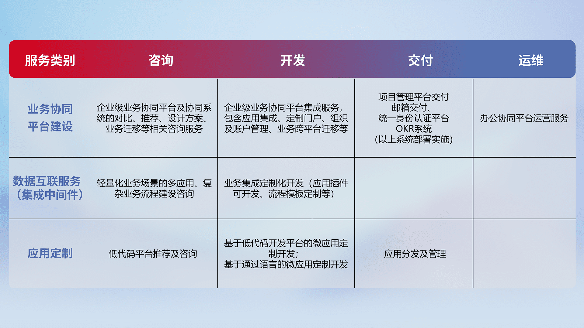 针对钉钉、、企微、、、IDaas等平台级产品提供产品的规划、、、、方案、、交付、、定制化开发等服务,,实现如统一协同办公、、、智能客户服务、、、混合会议管理、、、、智能数据查询、、、等业务场景,,,实现数字化转型。。。。